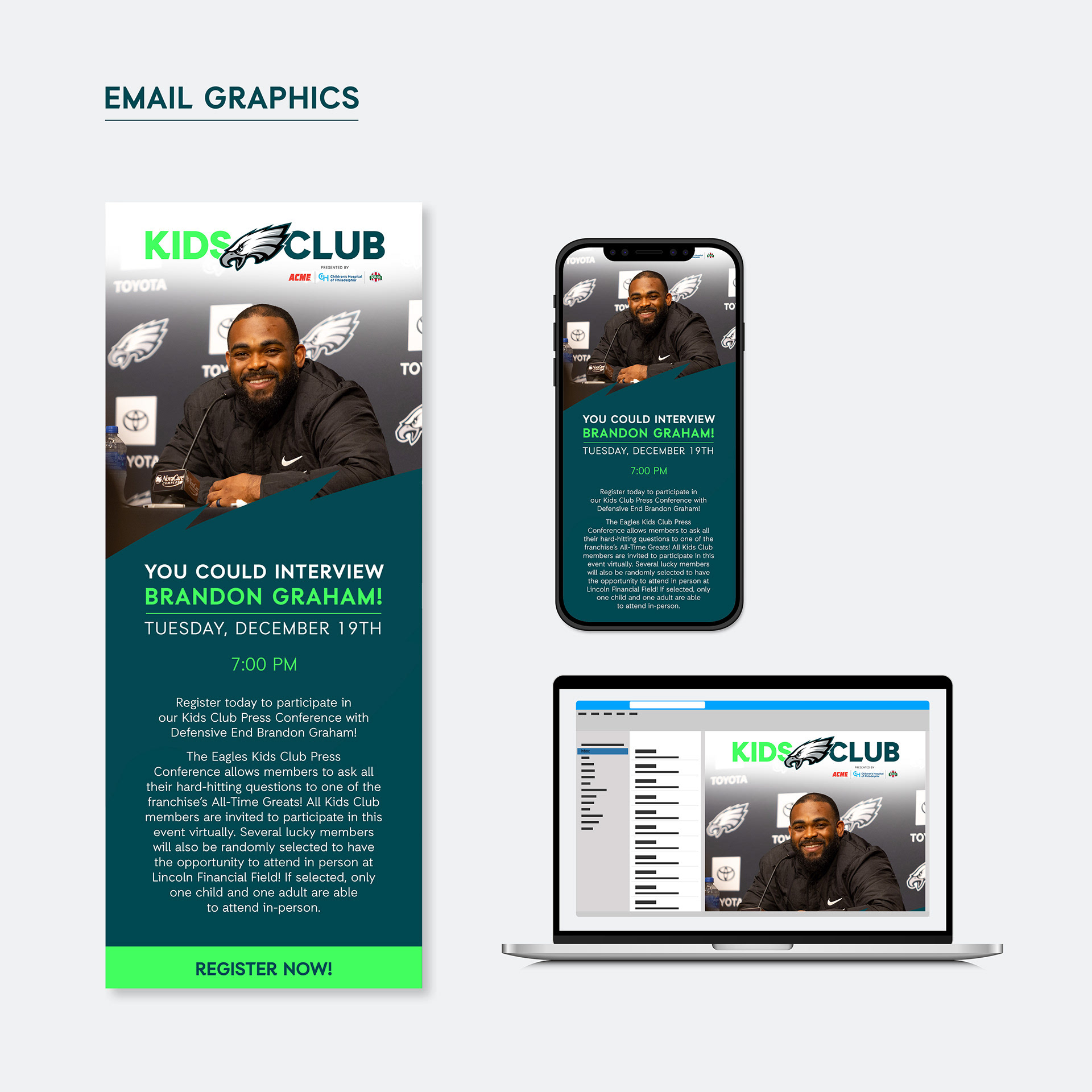 I utilized pre-existing brand assets to establish a cohesive visual identity and crafted a series of icons to promote the membership benefits of joining the Philadelphia Eagles Kids Club.